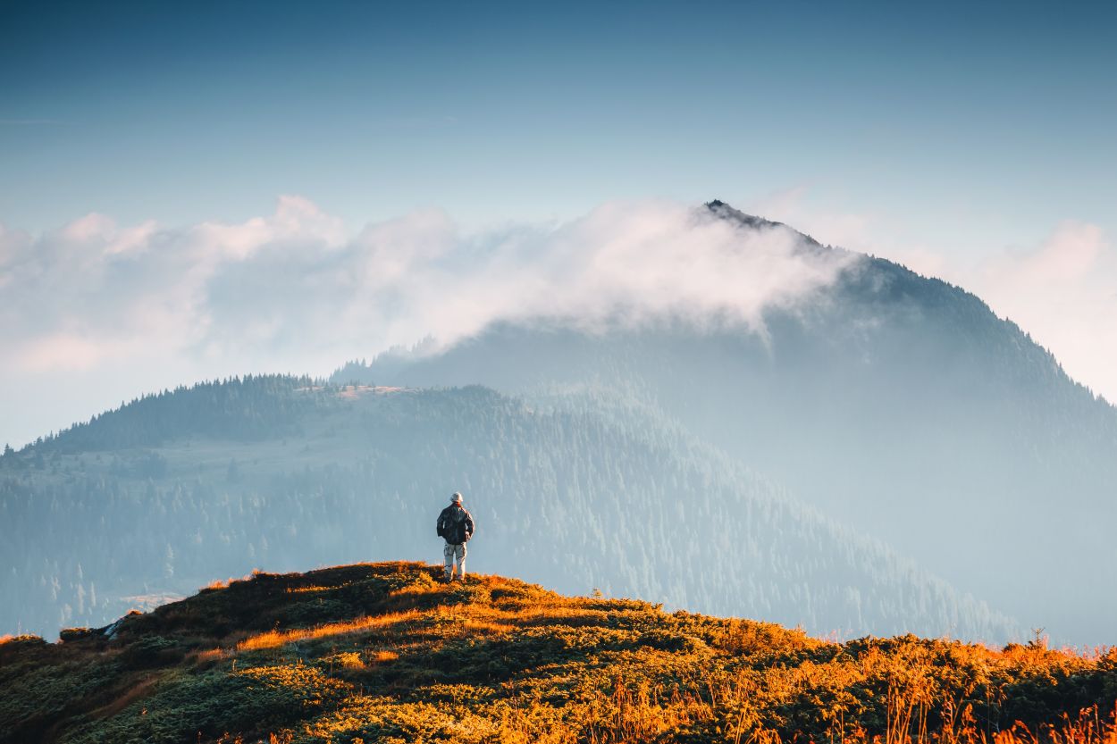 Person viewing hilly landscape with forest
